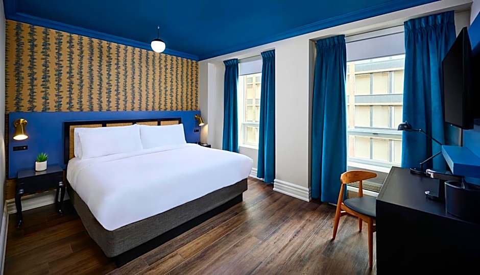 This room feature a pillow top mattress, fine linens and duvets. It is fitted with attractive hardwood floors and custom designed furniture. Amenities include free WiFi, a flat-screen HDTV with cable channels and Netflix. The room also offers a clock radio, fridge and coffee maker. The bathroom comes equipped with a spacious bathtub or glass shower stall and large sink. Guests will receive a complimentary newspaper each day.